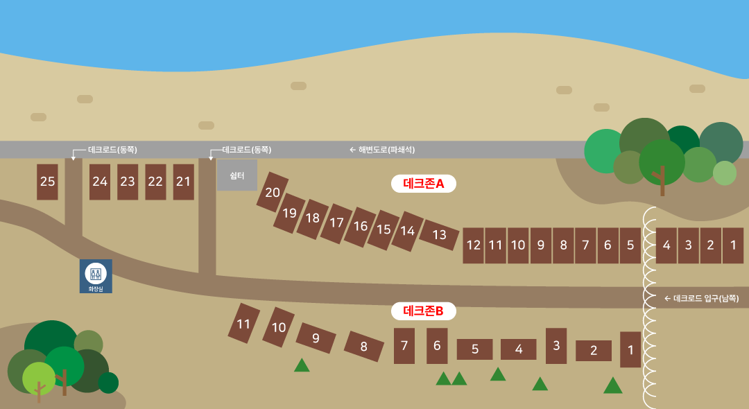 소나무숲에 조성되어 있는 데크존B(1~11번)입니다.